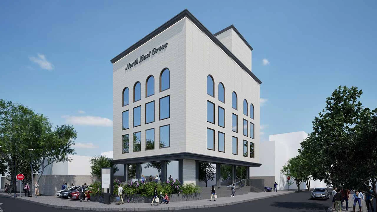 North- East Grove is a four-story commercial building project in Shankar Nagar, Nagpur owned by Plusgrow Merchantry. The use of brick textures, moldings, arches are the key design elements that combine to form a modern classic building.